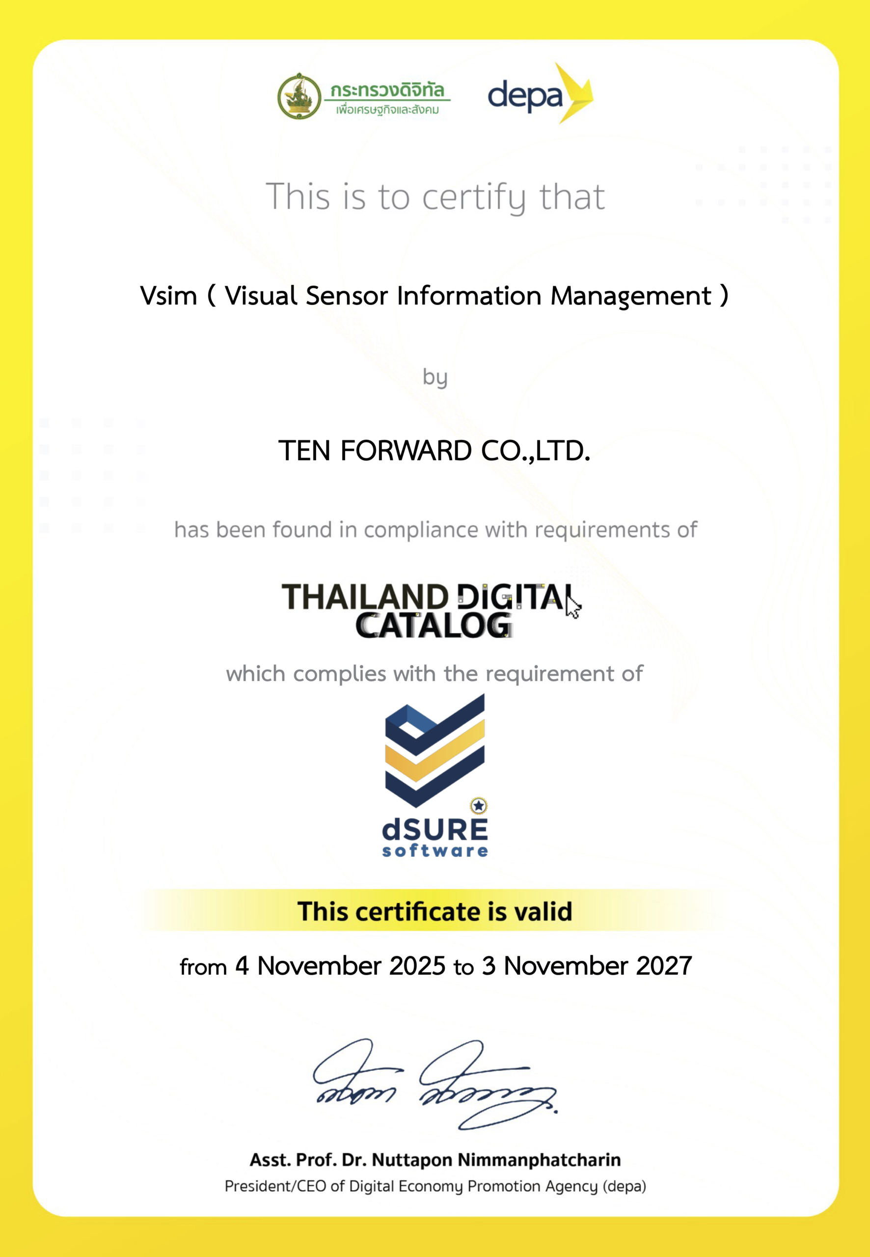 บริษัท TEN FORWARD มีความยินดีแจ้งให้ทราบว่าแพลตฟอร์ม Vsim (Visual Sensor Information Management) ของบริษัทฯ ได้รับใบรับรองบัญชีบริการดิจิทัลจากสำนักงานส่งเสริมเศรษฐกิจดิจิทัล (DEPA) อย่างเป็นทางการแล้ว